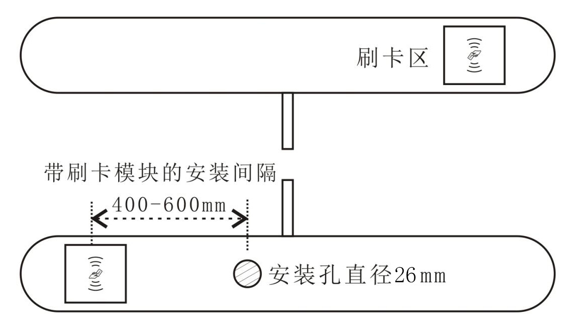 当闸机带刷卡功能时,安装人脸终端设备的开孔,应结合闸机高低尽量远离刷卡模块,推荐400mm及以上间隔,确保刷卡时抓拍清晰完整的人脸照片。若无刷卡模块,安装开孔位置无特殊要求。