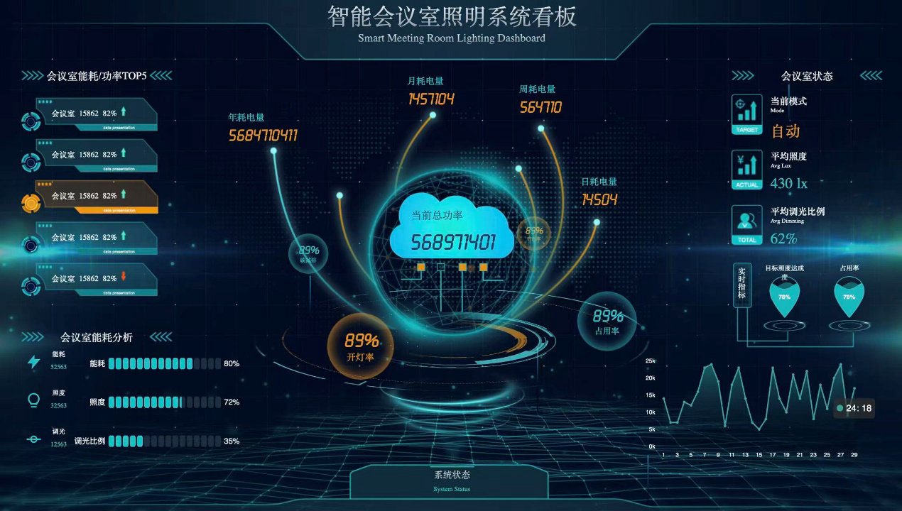 ●系统根据灯具亮灯时间及自动调光比例进行统计能源使用情况,显示当前的用电功率,及按天、周、月、年进行曲线图显示;
